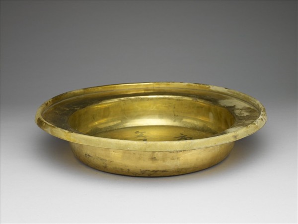 盤口,豎邊,淺壁,平底。銅胎鍍金,光素無紋。折沿下方邊緣右側鏨刻「同治四年」(1865),左側刻「造八成色金重庫平七十五兩」直向單行楷款。