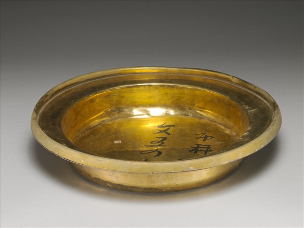 盤口,豎邊,淺壁,平底。銅胎鍍金,光素無紋。