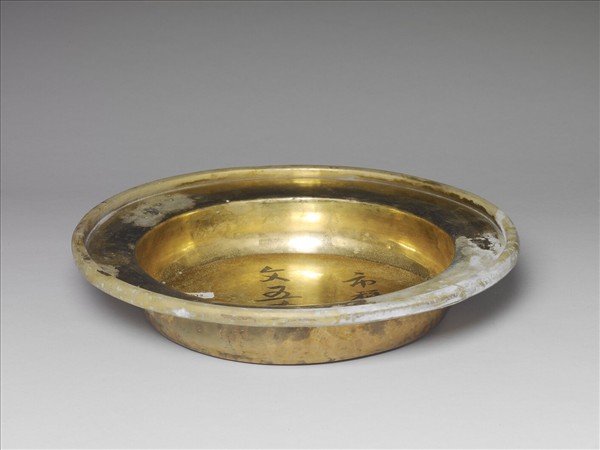 盤口,豎邊,淺壁,平底。銅胎鍍金,光素無紋。