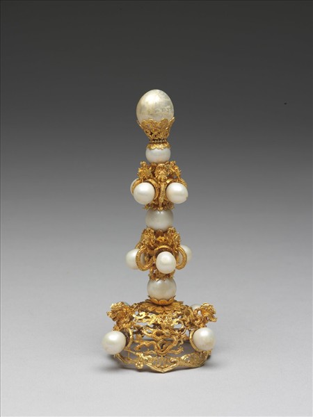 冠上綴朱緯,頂用三層東珠,最上銜大珍珠。仔細觀察康熙時期的這件鏤空金纍絲龍紋冠頂,可分為底座、中柱及頂三段,底座八龍四珠,座緣為相連的十二如意首,座頂為仰覆蓮座。中柱分二層,每層四龍四珠,層與層之間各以一珠相承,冠頂的珍珠一顆最大,以卷草靈芝紋托護,總共有珍珠十六顆。
