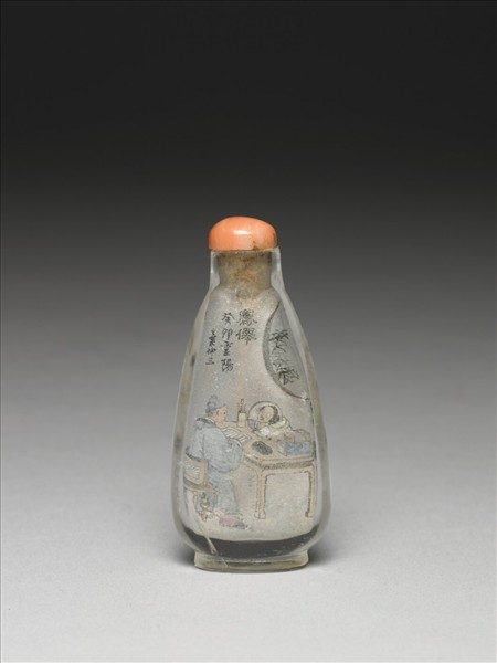 此件內繪人物畫,描繪關於鳳仙花療效的傳說,故以隸書題「醫術」及「鳳僊」,由「癸卯重陽,葉仲三」款題,可知此繪於光緒二十九年(1903)。帶珊瑚蓋與牙匙。共40件鼻煙壺裝於一木匣,收藏於華滋堂燕喜堂。