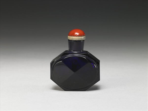葡萄色半透明玻璃八角形瓶,雙面橢圓開光突起四稜,有西洋風格。帶綠色茜牙托紅玻璃蓋與牙匙。雍正年間《活計檔》常見製作各色八角玻璃鼻煙壺,尤以葡萄色最受雍正青睞,應為此類型。