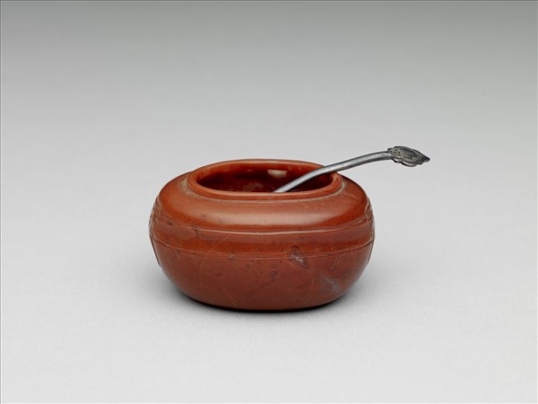 雄精為雄黃的一種結晶體,色橙紅。全器為一橢圓形水盛,圓口,平肩,深弧壁,平底。水盛外壁陰刻兩道弦紋,左右兩側各雕一獸面紋,獸口銜環。帶一銀匙,勺部呈桃形,上端刻桃葉。柄部末端為如意紋形。