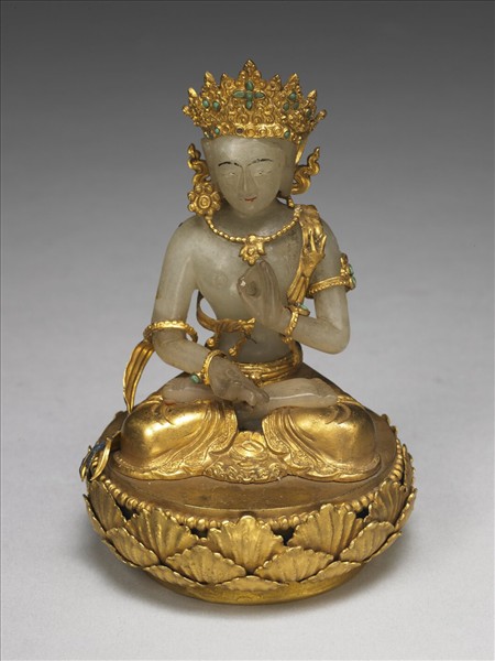 橢圓形臺座上,波浪起伏,自蓮池中央伸出一株蓮莖,向左右分枝延伸出兩株相連 的蓮座,三蓮座上各結跏趺坐一尊像,主次關係明顯。三尊像(故雜1835~1837)分別以珊瑚、白玉及青金石為頭、身及手足,佩戴金鑲綠松石的頭冠、耳飾、天衣、臂釧及手環,腰部以下為金身。橢圓形臺座表現淨土世界的蓮池。臺座內波濤起伏,波浪作斜向排列,營造出向後延伸的視覺空間。臺座下緣陰刻「大清乾隆年敬造」字樣。此為右側脅侍白玉菩薩像,左肩斜披羊首獸皮,佩戴的方式和清宮重要的造像指導著作《造像度量經續補》的記載相符。