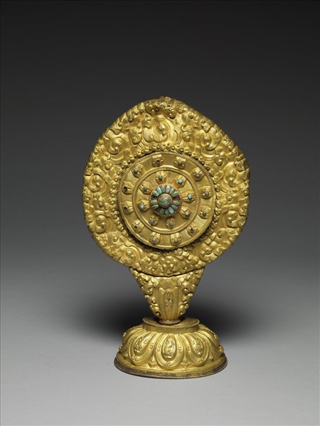 器作圓輪形,其外環以火焰形光環以象徵佛法崇高廣大,上有三處嵌松綠石火珠紋;輪心嵌一松綠石,外圍一圈小松綠石,輪心外有八道輻輳向外呈放射狀,每道輻輳上各嵌一顆松綠石,外圈有十二道光芒,輪下由卷葉承托置於蓮瓣座上。