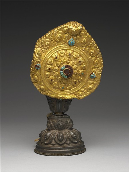器作圓輪形,其外環以火焰形光環以象徵佛法崇高廣大,上有三處嵌松綠石火珠紋;輪心嵌一松綠石,外圍一圈小松綠石及朵花紋,輪心外有八道輻輳向外呈放射狀,每道輻輳上各嵌一顆松綠石,輻輳間飾蓮花紋,輪下由卷葉承托置於蓮瓣座上。