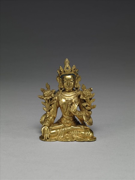 菩薩像,結跏趺坐,頭戴五葉冠,身披瓔珞,帛帶繞身;左手當胸撚花,右手膝前施願印並撚一莖花。面龐方正,重視轉折的立體感,嘴角向上呈笑意;寬肩細腰,形態端莊。造形與雕工似受永樂佛像的影響。附黃籤:「乾隆四十年收(1775),利益金造觀世音菩薩一尊,重十四兩二錢,鍍金座重六兩一錢」。