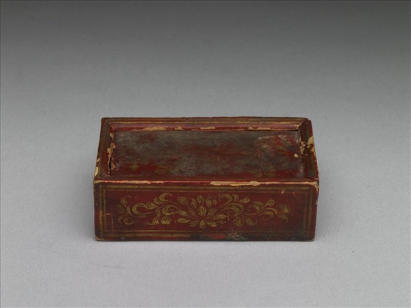 長方形木盒。全器髹紅漆,蓋及四壁外側繪金彩花卉,四壁加繪雙層金色方框。內儲故雜1871、1872金嵌松石佛鍋。