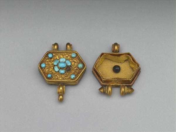 佛鍋作六邊形,蓋面以纍絲盤繞卷草,並鑲嵌綠松石組成花卉,做工精細,色澤瑩亮。二件小佛鍋共置在小木盒內,盒面飾紅地金彩花卉。附黃簽墨書楷字:「乾隆六十年十一月十六日,收班禪額爾德尼進九成金佛鍋二座,內供迦葉佛舍利二顆(共重六錢)。」(與故雜1871)