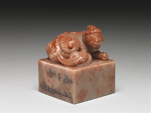 壽山石,乳白參雜紅色,印鈕處紅色部分較多。印面正方,未刻。印鈕雕一趴伏的異獸,異獸回首抿嘴,眉頭緊而向前平視,尾作渦漩羽狀,其側壁墨書︰「四年十二月卄七日壽山石」,為清代宮廷之記錄。