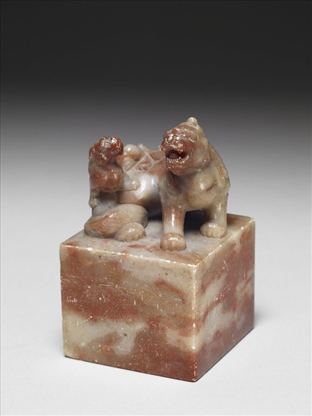 壽山石,紅、白相間的凍石,紅色淺,白色近乳白。方形印面,未刻。印鈕雕大小異獸各一,大獸蹲踞,側身回首、張嘴吼叫,尾部捲繞於右腳。小獸攀附於大獸尾部與身體之間,回首望向大獸,表現兩獸的微妙關係。