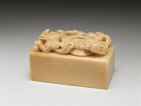 壽山石,顏色與牙黃相近,印面長方,未刻。印鈕雕刻精美,以龍穿梭飛舞於雲間為主調,龍身呈S形,中央環繞一環形器,栩栩如生。