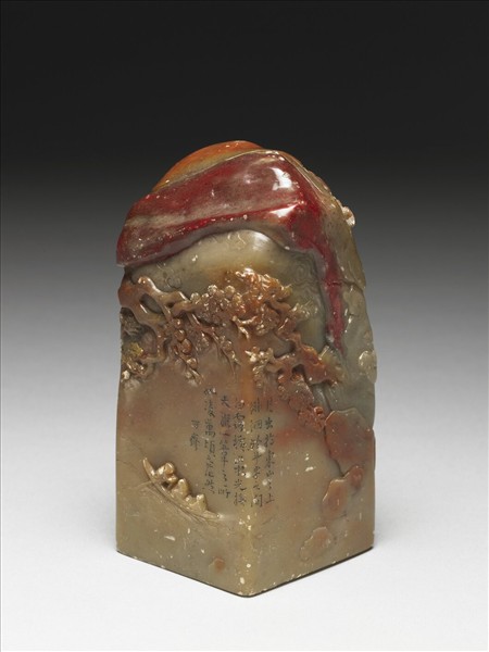 雞血石,為浙江昌化所產的印石,因石色有豔紅如雞血者而著稱。本件四方印,石色灰青微黃間淺硃色,而項端凝聚赤紅、暗紅的大塊斑。雕者佈色施刀,淺劃、深雕並舉,使暗紅處恰為山壁,江面淡紅如影相照;有古木伸出崖壁,樹蔭下一扁舟盪於波上,舟上是東坡、佛印與船夫,樹梢浮雲托一圓月,為「前赤壁賦」圖景。有行書小字邊款︰「月出於東山之上,徘徊於斗牛之間。白露橫江,水光接天,縱一葦之所如,凌萬頃之茫然。可齋。」賈鉉,字玉萬,號可齋。清康熙時山西臨汾人。工畫,出守黃山時嘗畫竹通識,命工人鎸諸石,置赤壁人所遊歷必經之地。畫石亦佳,所作百石圖,奇詭盡變,見稱藝林。