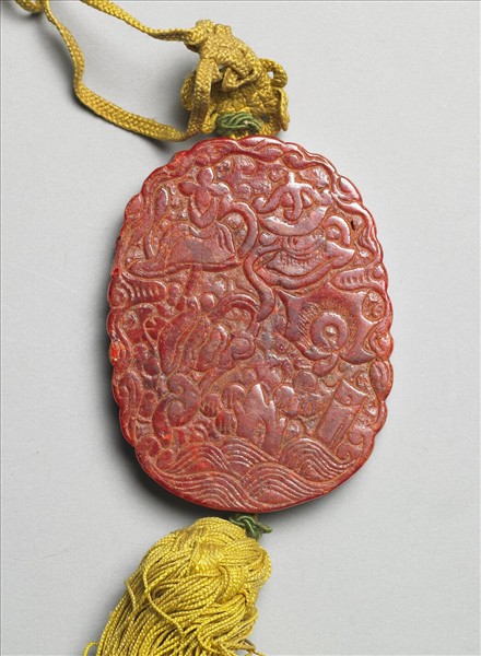 橢圓形雄黃石佩,色紅近珊瑚。外壁福山壽海與波濤之上,刻飾花朵以及魚、盤腸、傘蓋等雜寶。古人認為配戴雄黃石,可以驅除蚊蟲邪毒,以保護自身。