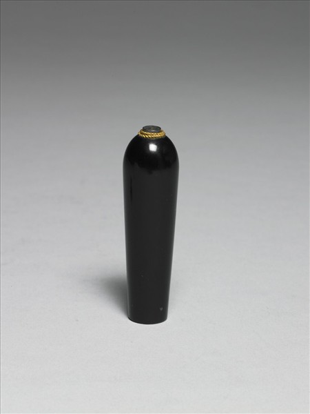 圓柱形黑色玻璃,一端徑大,一端徑較小。小徑端為圓口,大徑端弧起如彈頭,尖端小圓口,由黃籤上「造辦處呈覽黑玻璃小花插一件」等款識可知,此器為花插。帶四足牙座。