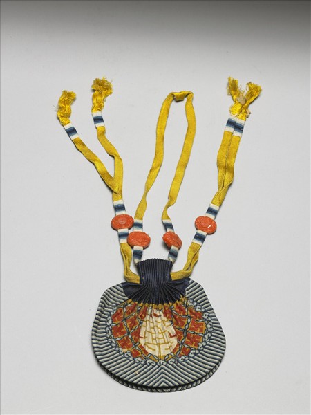 橢圓形布質袋,袋面圖紋以各色絲線織造而成。由外向內分別為立水紋、如意雲頭紋,內圈作紅卍字紋地,中央有白色壽字圖案。上方縫有藍束口布,中穿二黃線,一線成圈,可以用於配戴。另線兩出,用以束緊袋口。線上皆飾有珊瑚色扁圓形飾件,飾件上雕五福捧壽。