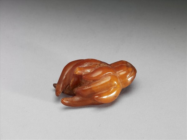 以蜜蠟製成一佛手形狀,色橙紅,周身光滑圓潤。