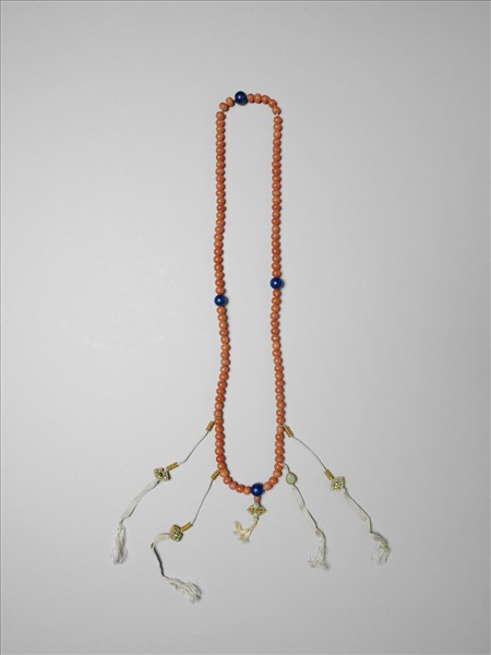清宮作品,十八世紀。長方漆匣,內有四屜格,每格有屜板、玻璃分隔,格內各置松綠石、青金石、珊瑚、琥珀製成的五方佛像一尊及同質材的數珠一串。(故雜1942-1949)漆匣係清宮所製的描彩漆盒,以番蓮與六字真言為主體裝飾,蓋壁飾七政寶,匣壁飾八吉祥;屜板戧金,裝飾題材亦相類;板內還髹藍漆,金書經文。五佛,為以大日如來為首的五尊佛,各呈不同身色,各結不同手印,各代表東、西、南、北與中央的方位,在不同的經義中有不同的配置。藏傳佛較常以珍珠、松綠石、青金石、珊瑚、琥珀等礦物代表五佛白、綠、青、紅、黃的五方五色。此為珊瑚數珠。與故雜1942同屜格。