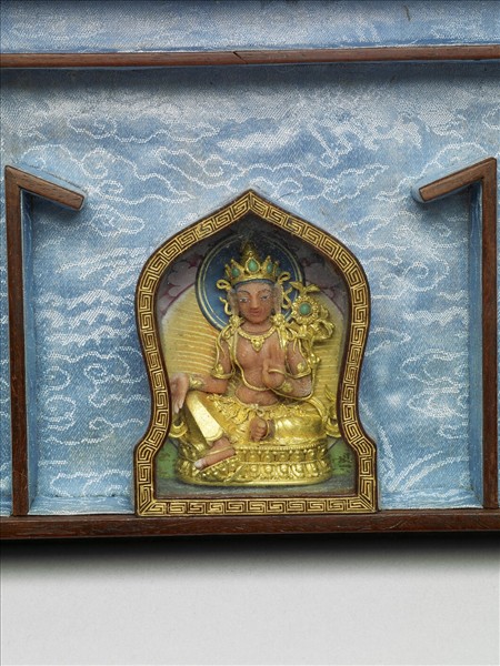 此為長方形描彩漆匣,外以番蓮與六字真言為主體裝飾,蓋壁飾七政寶,匣壁飾八吉祥。內存四屜格,每格以屜板、玻璃分隔。屜板戧金,裝飾題材為幢幡與四大天王手執法器;四屜格內各置綠松石、青金石、珊瑚、蜜臘製成之綠度母、黑度母、紅度母、黃度母五方救度佛母像及同材質數珠一串(故雜1950-1957),惟缺珍珠製成之白度母與數珠。屜板內尚髹藍漆,金書藏文,分別為該尊度母咒語、對治煩惱、所證功德等內容。本尊救度佛母由珊瑚製成,衣飾為金質,寶冠與花中嵌松石,與一同材質珊瑚念珠(故雜1956)合儲於漆匣的屜格內。