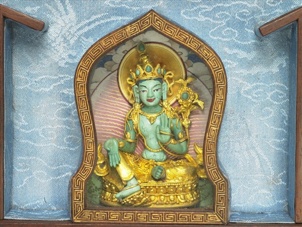 此為長方形描彩漆匣,外以番蓮與六字真言為主體裝飾,蓋壁飾七政寶,匣壁飾八吉祥。內存四屜格,每格以屜板、玻璃分隔。屜板戧金,裝飾題材為幢幡與四大天王手執法器;四屜格內各置綠松石、青金石、珊瑚、蜜臘製成之綠度母、黑度母、紅度母、黃度母五方救度佛母像及同材質數珠一串(故雜1950-1957),惟缺珍珠製成之白度母與數珠。屜板內尚髹藍漆,金書藏文,分別為該尊度母咒語、對治煩惱、所證功德等內容。本尊救度佛母由松石製成,衣飾為金質,寶冠與花中亦嵌松石,與一同材質松石念珠(故雜1955)合儲於漆匣的屜格內。