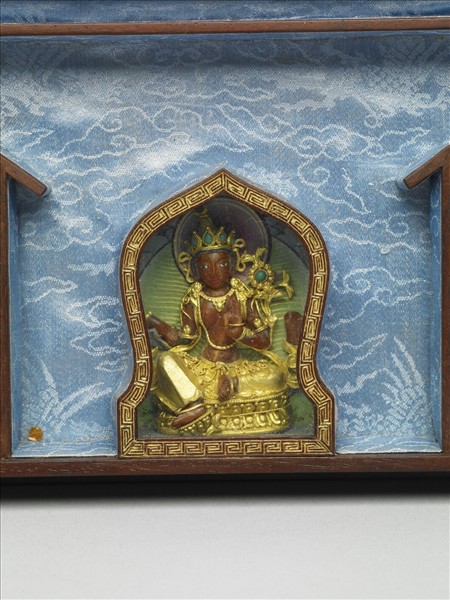 此為長方形描彩漆匣,外以番蓮與六字真言為主體裝飾,蓋壁飾七政寶,匣壁飾八吉祥。內存四屜格,每格以屜板、玻璃分隔。屜板戧金,裝飾題材為幢幡與四大天王手執法器;四屜格內各置綠松石、青金石、珊瑚、蜜臘製成之綠度母、黑度母、紅度母、黃度母五方救度佛母像及同材質數珠一串(故雜1950-1957),惟缺珍珠製成之白度母與數珠。屜板內尚髹藍漆,金書藏文,分別為該尊度母咒語、對治煩惱、所證功德等內容。本尊救度佛母由蜜蠟製成,衣飾為金質,寶冠與花中嵌松石,與一同材質蜜蠟念珠(故雜1956)合儲於漆匣的屜格內。