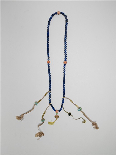 青金石念珠一串,計有青金石珠一百零八顆,每隔二十七顆加入一紅珊瑚佛頭,其中一佛頭連松石佛頭塔、二珊瑚珠夾鑲松石金剛杵。記捻四串,分別繫於佛頭塔兩側,三串為金色絛帶穿金算盤珠及金鑲松石花飾;一串絛帶由黃藍二色絲線夾織而成,穿金鑲藍色寶石圓墜。本串念珠與同材質救度佛母(故雜1953)合儲於漆匣的屜格內。念珠又稱為數珠,為佛教中記數之法物,數量不同,所表達之意義也各有差異,例如:一百零八顆念珠即象徵斷除人生中的一百零八種煩惱。