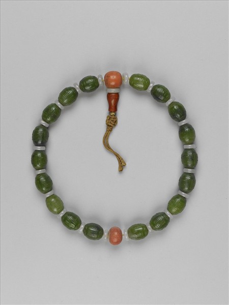 手串以黃絛帶穿成,計有碧玉珠十八顆,呈橄欖形,周身雕有團壽紋;每隔九顆碧玉珠加入一紅珊瑚佛頭,其中一佛頭接佛頭塔及藻井結;碧玉珠、佛頭、佛頭塔之間均夾有一白玉小托,共計二十一個。手串又稱十八子,原本應是握在手中念經記數的工具,自十八世紀中期以來,已逐漸成為祈福裝飾之用,也可作禮物互相贈送。