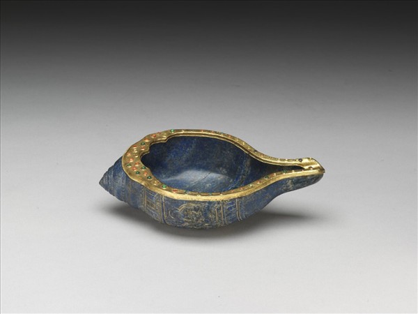 清宮作品,十八世紀。青金石雕作七層左旋螺狀。平口,包銅鍍金板,鑲各色碎石。器表浮雕並描金七佛與蓮瓣紋、連珠紋。