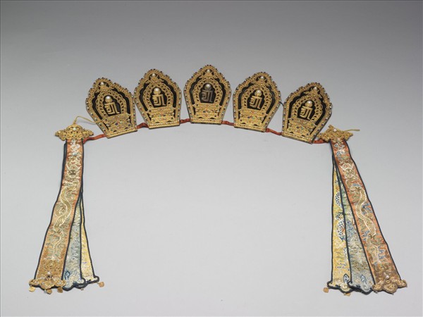 清宮作品,十八世紀。五葉狀寶冠,每葉以黑絨為襯,其上縫纍絲金飾;有火燄緣、蓮瓣紋及「十相自在」符號的梵文。並嵌小珍珠、松綠石、珊瑚、青金石等。附二組飄帶,各具紅、黃、籃三色,繡龍紋,上下飾嵌石之金飾片。五葉各一梵字代表五佛。