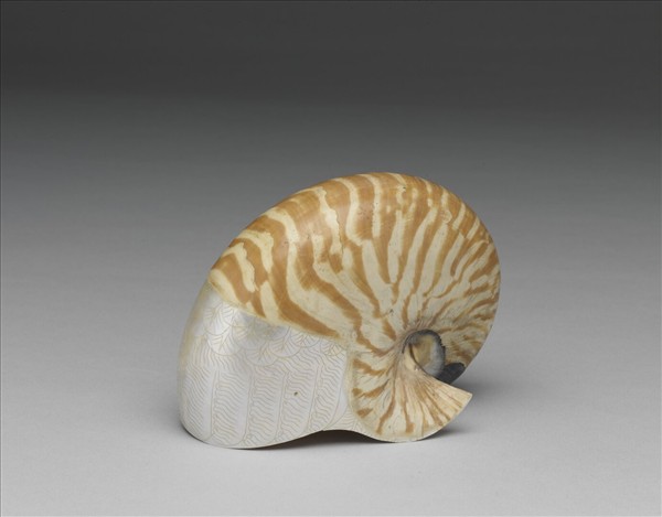 鸚鵡螺殼一個,質薄而輕;外殼光滑,呈白色,夾細密紅褐色生長紋。近口部處將表層螺殼剔除、露出具珠母光澤之內層,上淺刻魚鱗數片及海水波紋。附一掀蓋式長方形描漆皮盒,蓋頂為圓拱形,開口處以金屬鉤環扣合。盒緣均飾回紋,蓋頂及四壁中央有海棠形開光,內繪古錢紋錦地及花葉紋,隙地則滿繪龜甲紋錦地,並罩褐色透明漆料。盒內襯紅色雲紋緞裡,盒蓋處黏附一白帛上墨書漢、滿、蒙、藏四體文字曰:「利益花海螺一件」。