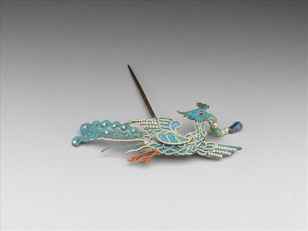 側身翔鳳式,鳳身點翠嵌米珠,足嵌珊瑚米珠,口銜流蘇。流蘇由小珍珠、翠玉蒲蘆、藍色寶石墜角串成。