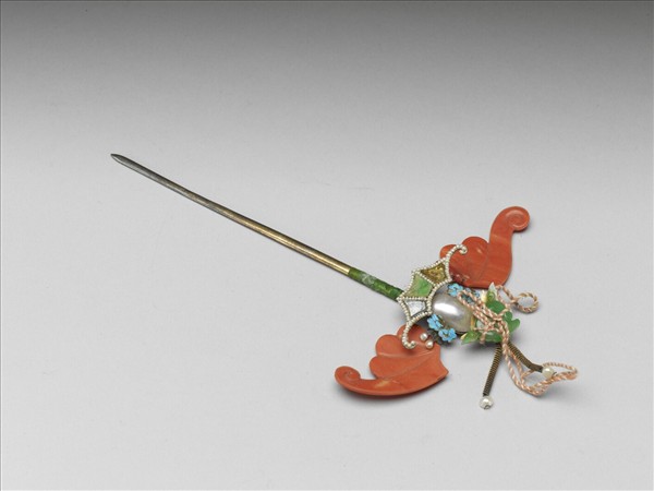 鍍金素挺簪一支,簪首作蝙蝠形。頭部由翠玉雕刻而成,五官清晰:圓眼,嘴微張,尖耳帶渦紋。頭部下方延伸出二金纍絲作觸鬚,末端各穿一珍珠。蝠身嵌一大塊卵形珠,兩側接紅珊瑚蝠翼,翼上淺雕出骨架;身體兩側與翼相連處各飾有一點翠如意雲紋及二米珠,以掩飾翼上之穿孔。尾部呈扇狀展開,由米珠鑲嵌基本輪廓,中嵌翠玉、藍色及茶色寶石。