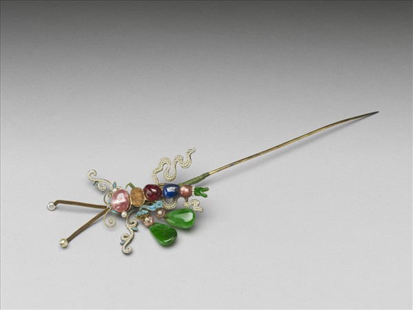 鍍金素挺簪一支,簪首作蝴蝶形。二米珠為眼,頭部與腹部鑲嵌翠玉、粉紅碧璽等各色寶石,尾部為翠玉製,腹部與尾部以一圈米珠作區隔。觸鬚二對,一為金屬絲拗彎而成,一為纍絲,纍絲觸鬚末端各穿一珍珠。羽翅二對,均為粉紅碧璽梅花嵌米珠接水滴形翠玉;身體兩側與羽翅相連處各飾有一點翠如意雲紋及卍字。嵌滿米珠之飄帶由腹部向頭尾蜿蜒而出,近頭部處間飾點翠。此珠寶蝴蝶身體微曲,羽翅展開,飄帶靈動,呈翩翩飛翔之姿。全器造型別緻,作工精巧。