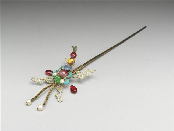 鍍金素挺簪一支,挺呈扁平狀,簪首作蝴蝶形。二珍珠為眼,頭部與腹部鑲嵌翠玉、粉紅碧璽等各色寶石,尾部為翠玉製。觸鬚二對,一為金屬絲拗彎而成,一為纍絲,纍絲觸鬚末端各穿一珍珠;羽翅二對,均為水滴形紅寶石;身體兩側與羽翅相連處各飾有一點翠如意雲紋及卍字。嵌滿米珠之飄帶由腹部向頭尾蜿蜒而出。此珠寶蝴蝶身體微曲,羽翅展開,飄帶靈動,呈翩翩飛翔之姿。全器造型別緻,作工精巧。