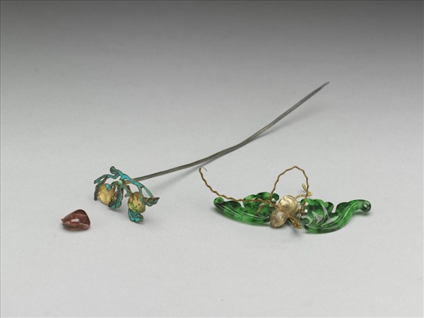 銀鍍金素挺簪一支,簪首為一蝠二桃。蝙蝠頭部與身體由淺黃色寶石雕刻而成,翠玉蝠翼上淺雕出骨架;蝠身與雙翼連接處飾有米珠,以掩飾玉上之穿孔。頭部下方伸出二纏繞金屬絲作觸鬚。桃形底座嵌紫紅色寶石作桃實,枝葉點翠。