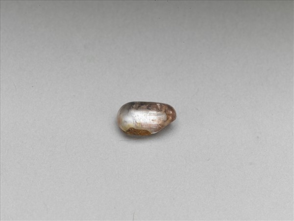 似卵形碧璽一塊,呈粉紅色。通體打磨光滑,可見內部天然結晶紋理,有璺。表面殘留黏著痕跡,疑似嵌件脫落。