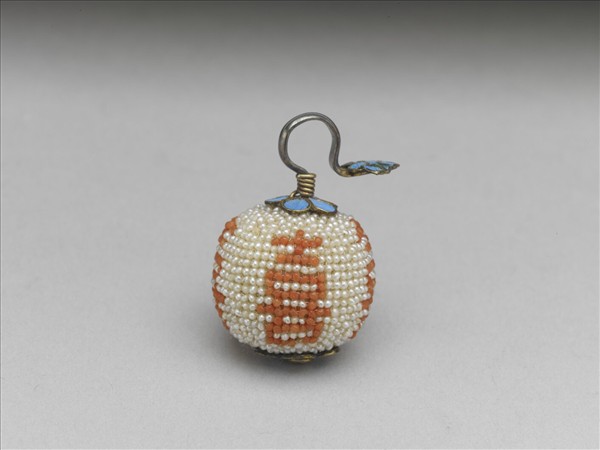 圓球形器,表面緝白紅二色米珠,做出白地等距飾喜字的紋樣。珠一端有金屬鉤,鉤端有如意雲頭形飾片。珠上下有花形飾片各一,皆點翠滿飾。由喜字看來,本器或是為了婚宴而製作。