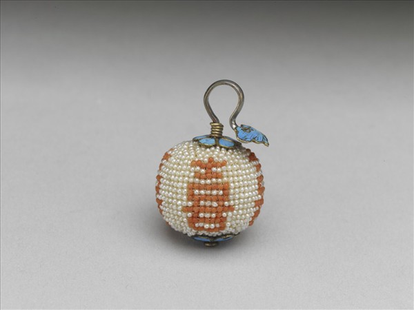 圓球形器,表面緝白紅二色米珠,做出白地等距飾喜字的紋樣。珠一端有金屬鉤,鉤端有如意雲頭形飾片。珠上下有花形飾片各一,皆點翠滿飾。由喜字看來,本器或是為了婚宴而製作。