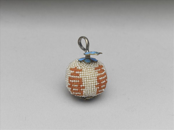 圓球形器,表面緝白紅二色米珠,做出白地等距飾喜字的紋樣。珠一端有金屬鉤,鉤端有如意雲頭形飾片。珠上下有花形飾片各一,皆點翠滿飾。由喜字看來,本器或是為了婚宴而製作。