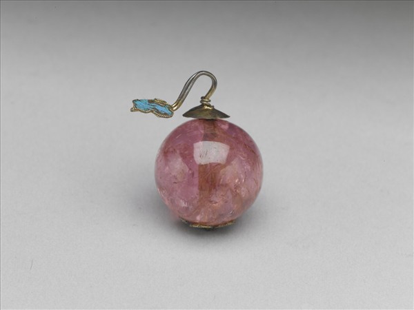 粉紅色碧璽鈕子,圓球狀,有通心穿,金屬條貫穿其間,通心穿一端為點翠花形金屬飾片。金屬條一端拗彎如鉤狀,並接連一如意雲頭狀點翠。