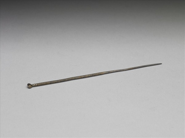 銀鍍金尖鋌簪,樣式簡單,作一長針貌,中段之後飾以細密的螺線紋,末端作耳挖式,故稱耳挖簪。