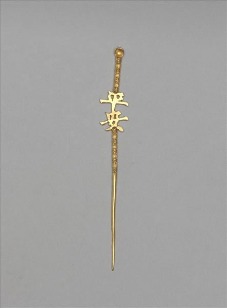 金屬素鋌耳挖簪。整器作一長針貌,中段之後鏨飾蓮子紋,並銲黏「平安」二楷字片狀飾件,末端作耳挖式,整體製作訴求明確(平安),簡單大方。院藏一式兩件成對。(故雜2107與故雜2108)