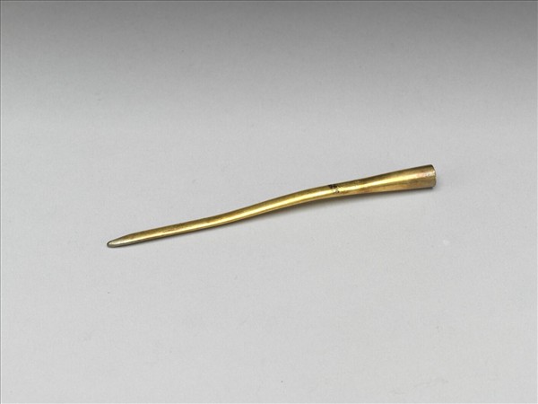 銀鍍金簪鋌,金黃色,內外光素無紋,僅器壁外有戳記「五」「華」「足」「銀」四字。整器為一長錐狀管,整體五分之四皆略壓平,僅口徑較大的開口處保持原狀,或可用以插置安裝其他飾件。