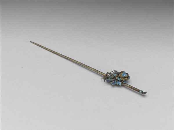 耳挖式素鋌簪,簪首作蚱蜢攀於盛開花旁,昆蟲身體與花蕊多處以燒藍裝飾,其色或作深藍,或淺色近白,呈現更豐富的裝飾層次感。