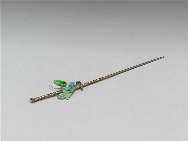 金屬耳挖簪,簪首破損。由其殘件看來,或許簪首原作葫蘆一類的主題。