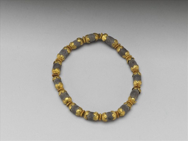 伽楠手鐲,以十五顆伽楠木珠串成,木珠近橢圓、色褐如蓮子,各珠兩端以鍍金花托包覆,花托上敲花出細緻的花瓣紋路,相連的花托間皆有一鍍金線圈。