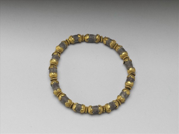 伽楠手鐲,以十五顆伽楠木珠串成,木珠近橢圓、色褐如蓮子,各珠兩端以鍍金花托包覆,花托上敲花出細緻的花瓣紋路,相連的花托間皆有一鍍金線圈。