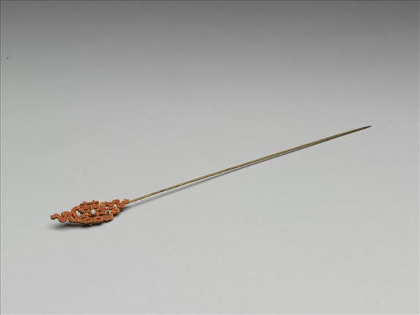 緝珠囍字簪,簪挺鍍金,簪首以珊瑚米珠緝出「囍」字,「囍」字兩旁復以珊瑚米珠緝為祥雲,「囍」字中央飾珍珠一顆,樣式充滿喜氣,作工精緻。