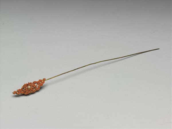 緝珠囍字簪,簪挺鍍金,簪首以珊瑚米珠緝出「囍」字,「囍」字兩旁復以珊瑚米珠緝為祥雲,「囍」字中央飾珍珠一顆,樣式充滿喜氣,作工精緻。