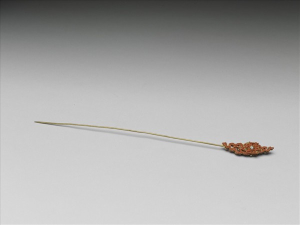 緝珠囍字簪,簪挺鍍金,簪首以珊瑚米珠緝出「囍」字,「囍」字兩旁復以珊瑚米珠緝為祥雲,「囍」字中央飾珍珠一顆,樣式充滿喜氣,作工精緻。
